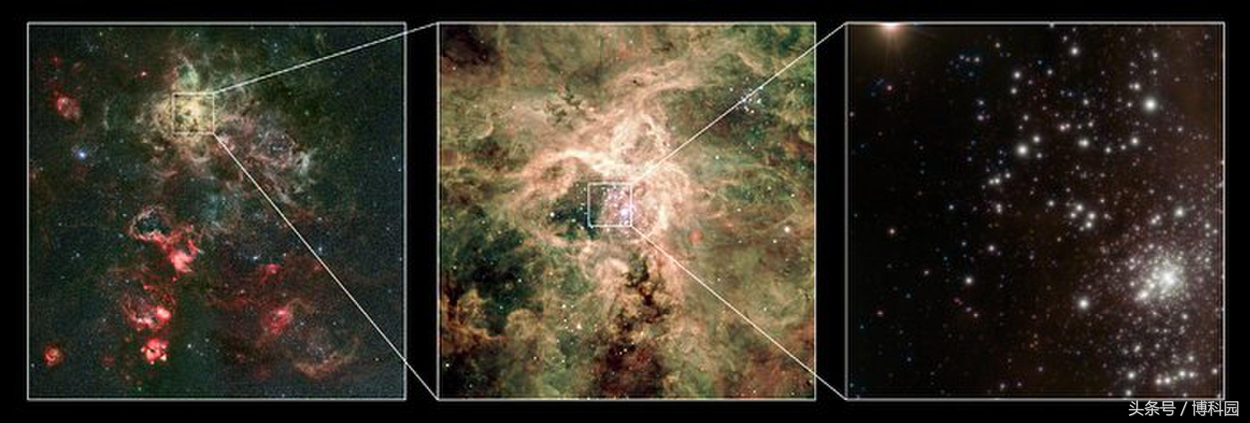 这张来自欧洲南方天文台超大望远镜图像中捕获最大的,大约是太阳质量的256倍,位于狼蛛星云内的恒星托儿所RMC 136a,在我们的邻近星系之一的大型麦哲伦云,165000光年远。图片:ESO / VLT
