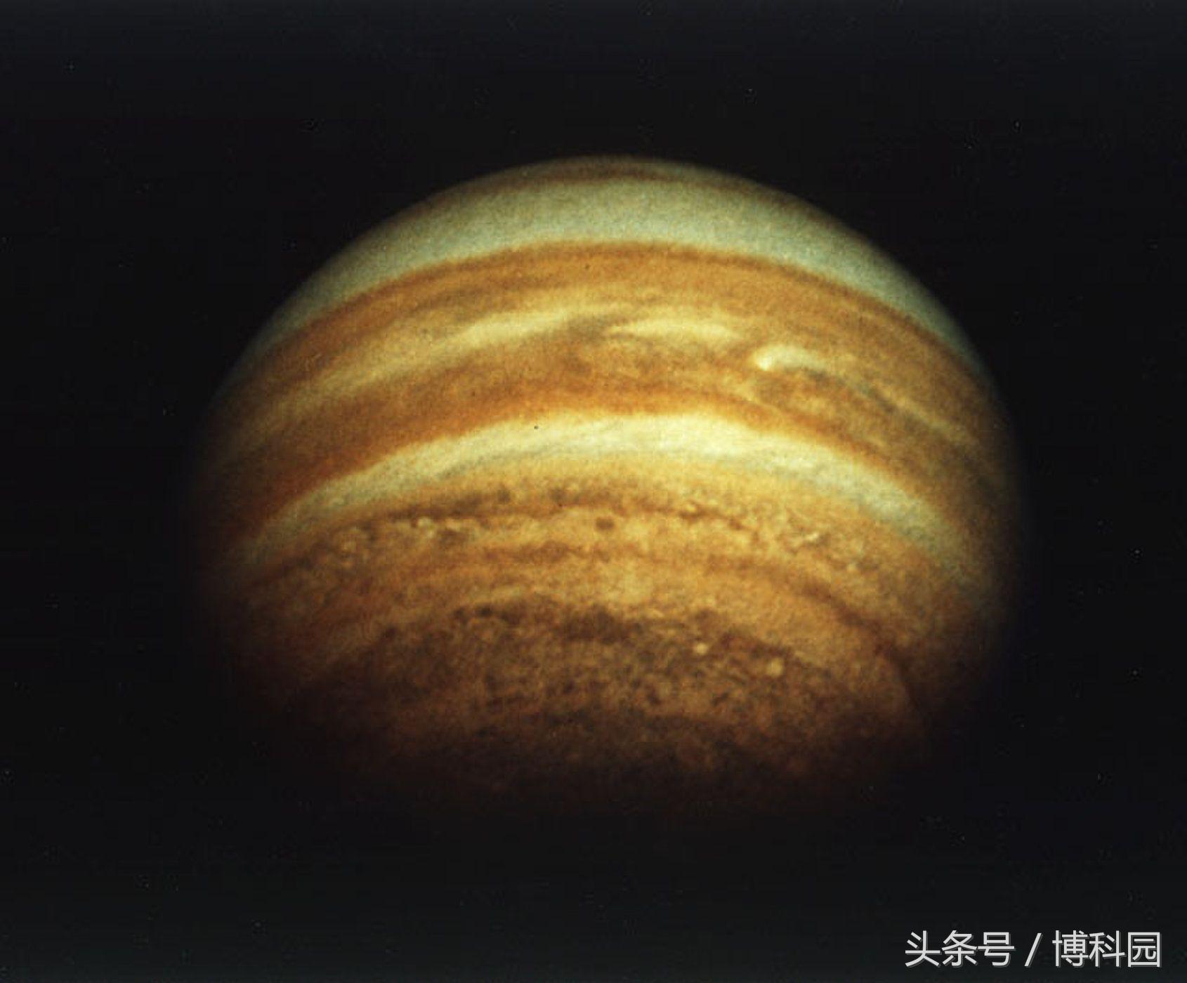 1974年先锋11号在其北极上空俯瞰木星,木星是太阳系中最大的行星,但距离已知的最大行星还相差很远。图片:NASA Ames