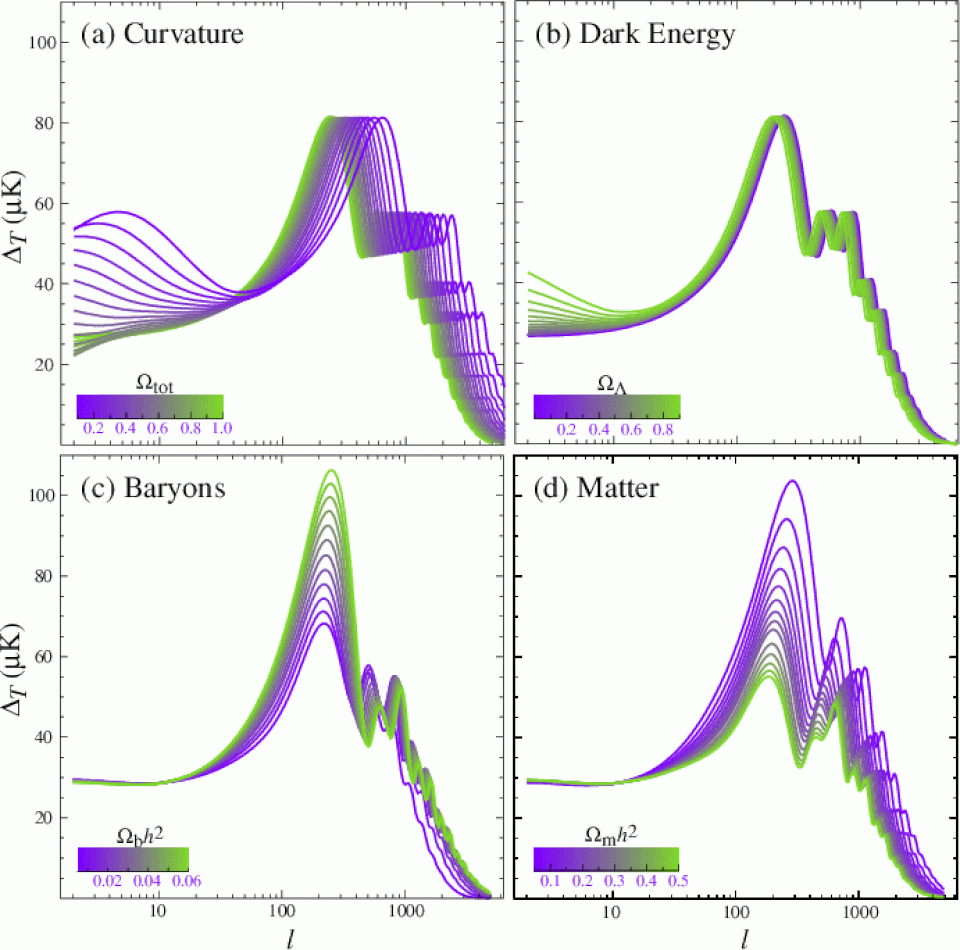 宇宙微波背景辐射(CMB)峰值的结构由宇宙中欧什么东西决定。图片:W. Hu and S. Dodelson, Ann.Rev.Astron.Astrophys.40:171–216,2002