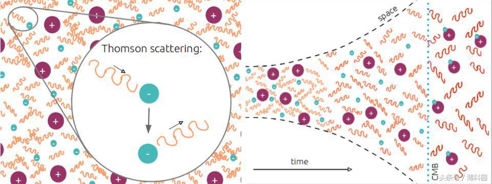 在宇宙冷却到足以形成中性原子之前,光子在周围飞来飞去,并且毫不留情地进入电子。无论何时何地,这种现象总是在不停发生。在形成中性原子之后,只有非常非常特别波长的光子,即导致特定原子的电离或原子跃迁的波长,才能相互作用。在宇宙超过冷却临界值之前,光子和正常物质以极高的速率相互作用。宇宙变成100%充满中性原子和充满离子0%之后,这些光子就以直线的方式流动;它们的波长,在过去的138亿年里,随着宇宙的膨胀而延伸,今天,到达我们的眼睛和探测器。