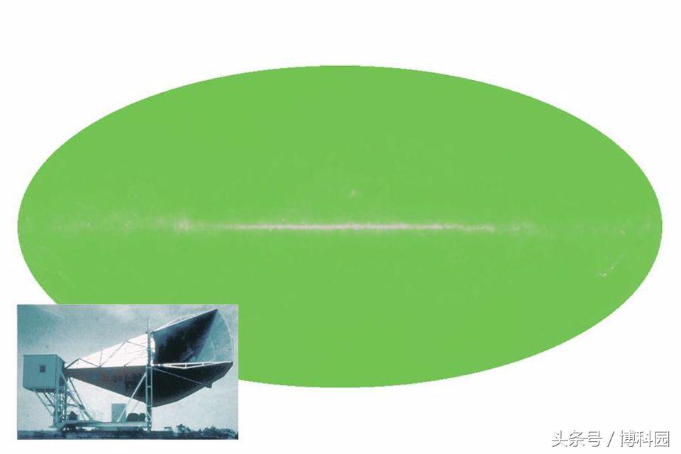 根据彭齐亚斯和威尔逊的原始观察,银河系平面发射了一些天体物理的辐射源(中心),除了上方和底部,其余部分是一个近乎完美的辐射背景。图片:NASA / WMAP Science Team