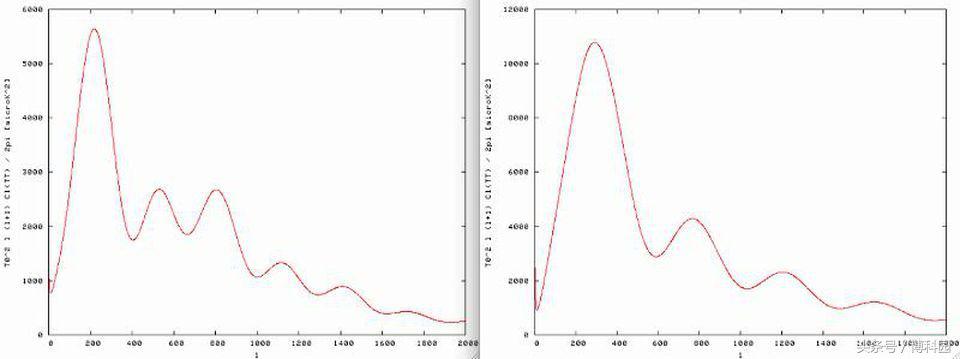模拟温度在不同角尺度内的波动,将于宇宙微波背景辐射中测量的宇宙辐射一起出现,然后发现70%暗能量,25%的暗物质,5%的正常物质(L),或有100%的正常物质的宇宙(R)。峰的数目以及峰高和位置的差异一目了然。图片版权:E. Siegel / CMBfast