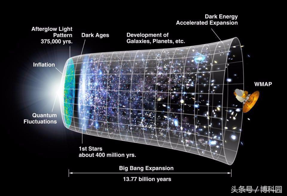 当观测可观测宇宙历史时间轴时,就越向前远离大爆炸的时间节点,可以观测到的部分变得越来越宽阔。然而,大爆炸留下的余辉今天依然可见。图片:NASA / WMAP science team