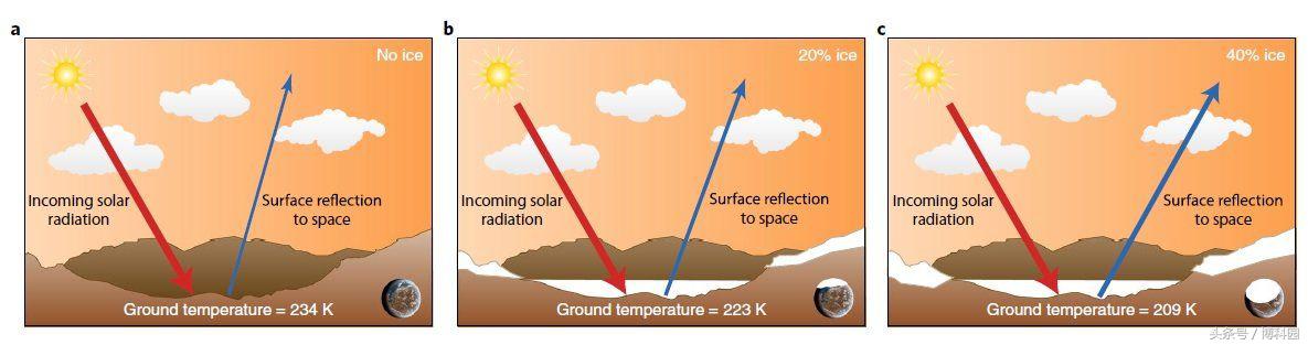 早期火星表面能量平衡的简化表现为地表温度的下降,地表冰量的增加。表面反射率的增加是由一个不断扩大的蓝色箭头表示。图片:Ramirez and Craddock (2018), Nature Geoscience