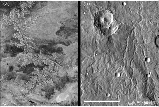大峡谷(a)与火星树枝状河流系统(b)(阿拉伯四边形,地球和火星之间的比较有轻微的形态学差异,这可能是由于年龄的差异造成的,比例尺为60公里。图片:Google/Landsat/Copernicus (a) and Google/NASA/JPL/University of Arizona (b). Images adapted from Ramirez and Craddock (2018), Nature Geoscienc