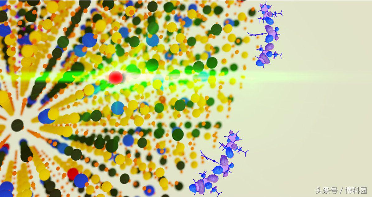 在纳米晶体中,一个铒原子(红色)通过一个被称为“向上转换”的过程发出可见光,这可能会导致改进的太阳能电池的发展,从而捕捉到以前错过的太阳能。科学家们发现,用染料(蓝色和紫色的分子)在粒子上涂上颜色可以大大增强这种光转换性能。图片:Lawrence Berkeley National Laboratory