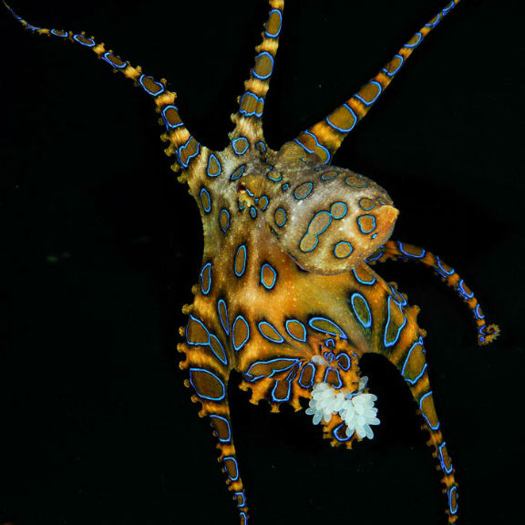 令「变色龙」望尘莫及的是「章鱼」软软的身体还能够改变外形,堪称海底的“变形金刚”。一种印度尼西亚「拟态章鱼」它能够模仿海蛇、比目鱼、海星、狮子鱼、珊瑚等15种动物。如果你在海底看见一个海螺,过了一会儿,海螺又长出来了两只腿跑了起来,那一定是「章鱼」在模仿海螺,并趁机逃跑来躲避捕食者。当「章鱼」们看见攻击它们的鱼类时,会把身子埋起来,然后把触手变成毒蛇的样子吓跑对手。如果在它们附近的海床上,椰子树经常掉落椰子,「章鱼」就会经常模仿椰子来躲避天敌。即便是在自然界「章鱼」们从来都没有见过的图案或者那些不规则的复杂图案,它们也能够很快的变换相应的颜色和纹理。