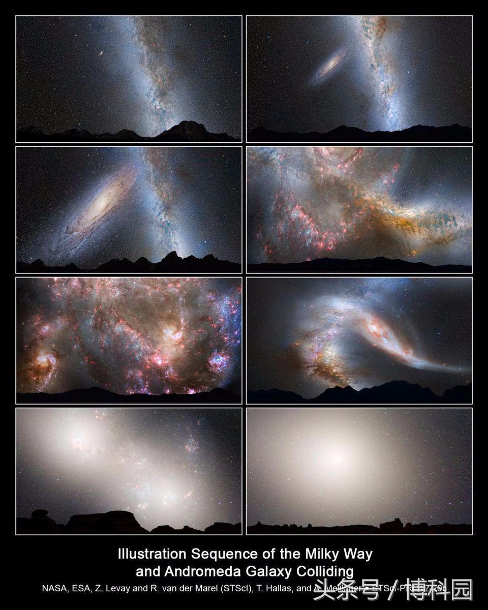 图注:一系列模拟图片展示了银河系和仙女座星系的合并,以及天空在发生过程中与地球的不同。这一合并将在未来大约40亿年发生,伴随着巨大的恒星形成,导致一个红色死亡,无气体的椭圆星系:Milkdromeda。图片:NASA; Z. Levay and R. van der Marel, STScI; T. Hallas; and A. Mellinger
