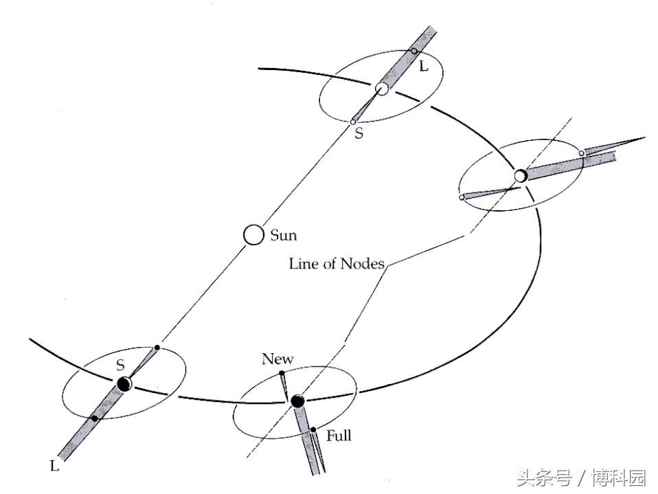 为了使月食发生,月球轨道的节点必须在新月或满月期间与地球太阳平面相一致。月球的近地点和蓝月亮对齐是一个更罕见现象。图片:James Schombert / University of Oregon