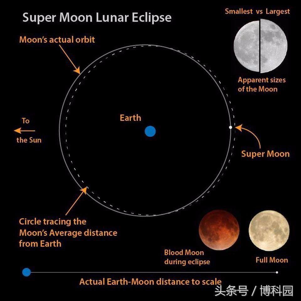 当月球绕着地球运行时,它不仅经历了从新月到满月再到新月的阶段,而且在地球周围的一个椭圆轨道上移动。当它在离地球最远的远地点时,距离地球有406700公里;在近地点时月亮距离地球有356400公里,此时它与地球最为接近。当满月在近地点(或近地点)在其轨道上重合时称之为“超级月亮”。