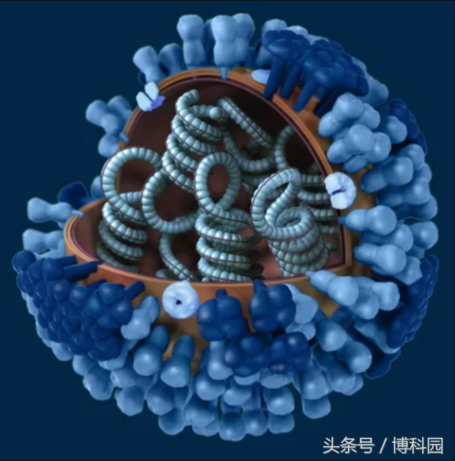 这个3D模型展示的是一种普通流感病毒(有不同类型)。根据世界卫生组织数据,季节性呼吸道感染造成严重病例约有300万至500万例,全球每年约有25万~50万人死亡。然而周期性病毒感染更具破坏性。1918年全球约有5000万人因流行病死亡。从近年来“猪流感”和“禽流感”造成的恐慌来看,一些流感病毒可以跨越物种传播。
