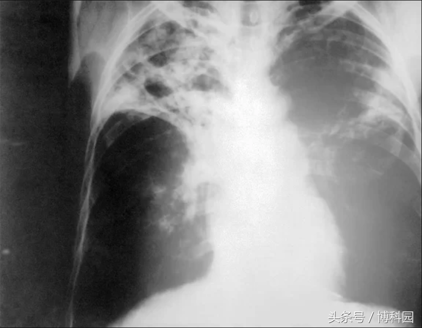 可能致命的“肺结核”是由结核分枝杆菌引起,这种细菌通常会攻击肺部并引起咯血。图中x射线显示了一位患有晚期肺结核的病人胸部。这种细菌并不能使每个人感染肺结核,目前世界上有三分之一的人携带了这种细菌。