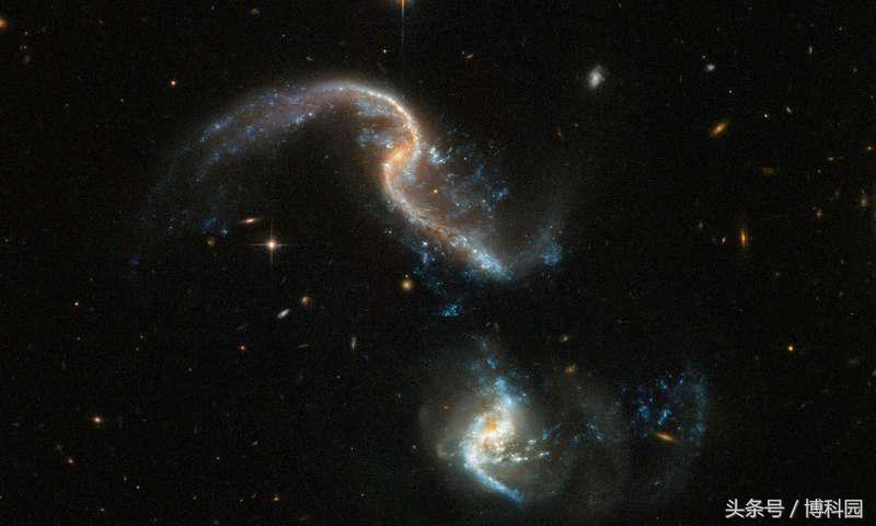 【博科园–科学科普(关注“博科园”看更多)】星系不是恒星的静态岛屿——它们是动态的、不断变化的,在宇宙的黑暗中不断移动。有时就像这张壮观的哈勃望远镜拍摄的Arp 256的图像一样,星系在宇宙的碰撞中会发生碰撞。在3.5亿光年远的鲸鱼座(海怪)中,一对被禁止的螺旋星系刚刚开始了一场宏伟的合并。这幅图像在一瞬间将它们悬挂起来,冻结了气体、尘埃和恒星的混沌喷射,引力将两个星系拉在一起。虽然它们的原子核仍然相距很远,但Arp 256星系的形状却被严重扭曲了。图片上部的星系有非常明显的潮汐尾流——长长的、延伸的气体、尘埃和恒星带。