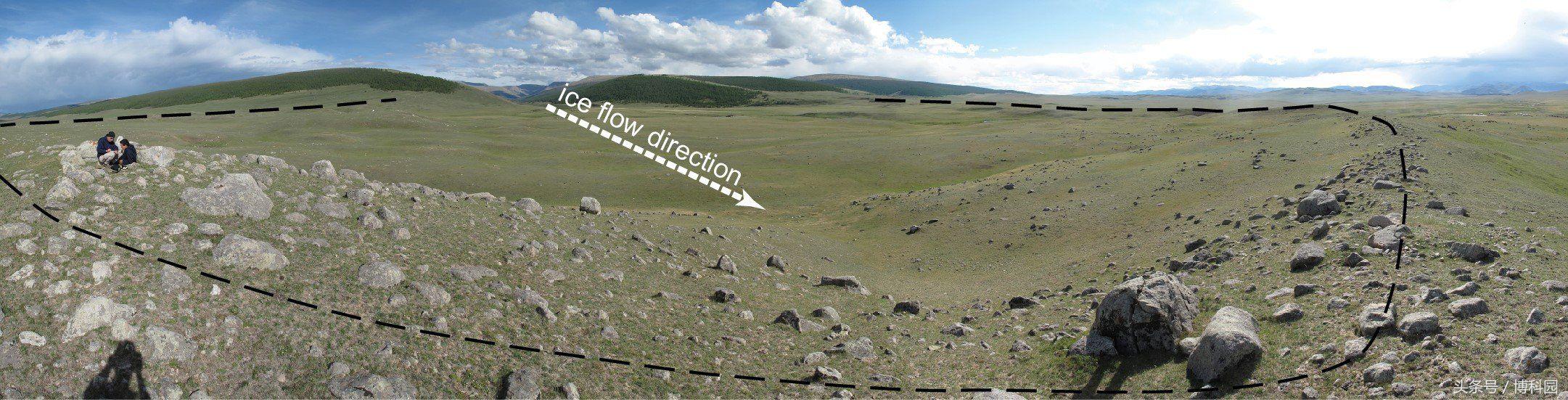 在一个冰碛石上,一群巨石离开了冰川,与此同时另一位作者阿里·马特蒙和他的儿子一起收集岩石样本。这个地点在蒙古的Khangai山脉。图片版权:Jigjidsurengiin Batbaatar /华盛顿大学