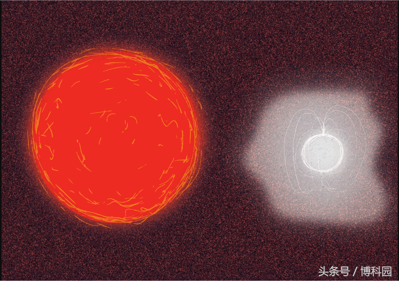 这种配对当然很奇怪。欧空局的xmm –牛顿和美国宇航局的天体太空望远镜显示,中子星几乎每两个小时自转一次——与其他中子星相比,速度非常慢,而其他中子星的自转速度可达每秒许多次。然后,这颗中子星磁场的第一次测量显示它的强度惊人。一个强大的磁场通常指向一个年轻的中子星——这个磁场被认为会随时间而消失——而一个红巨星的年龄要大得多,这使得他们在一起长大成为一对奇怪的夫妻。这些东西令人费解,可能是中子星磁场不会随着时间的推移而大量衰减,或者中子星实际上是在二进制系统的历史中形成的。这将意味着它从一个白矮星变成了中子星,这是由于在很长一段时间内从红巨星那里得到的结果,而不是由于一颗短命的大质量恒星的更传统的超新星爆炸而成为中子星。