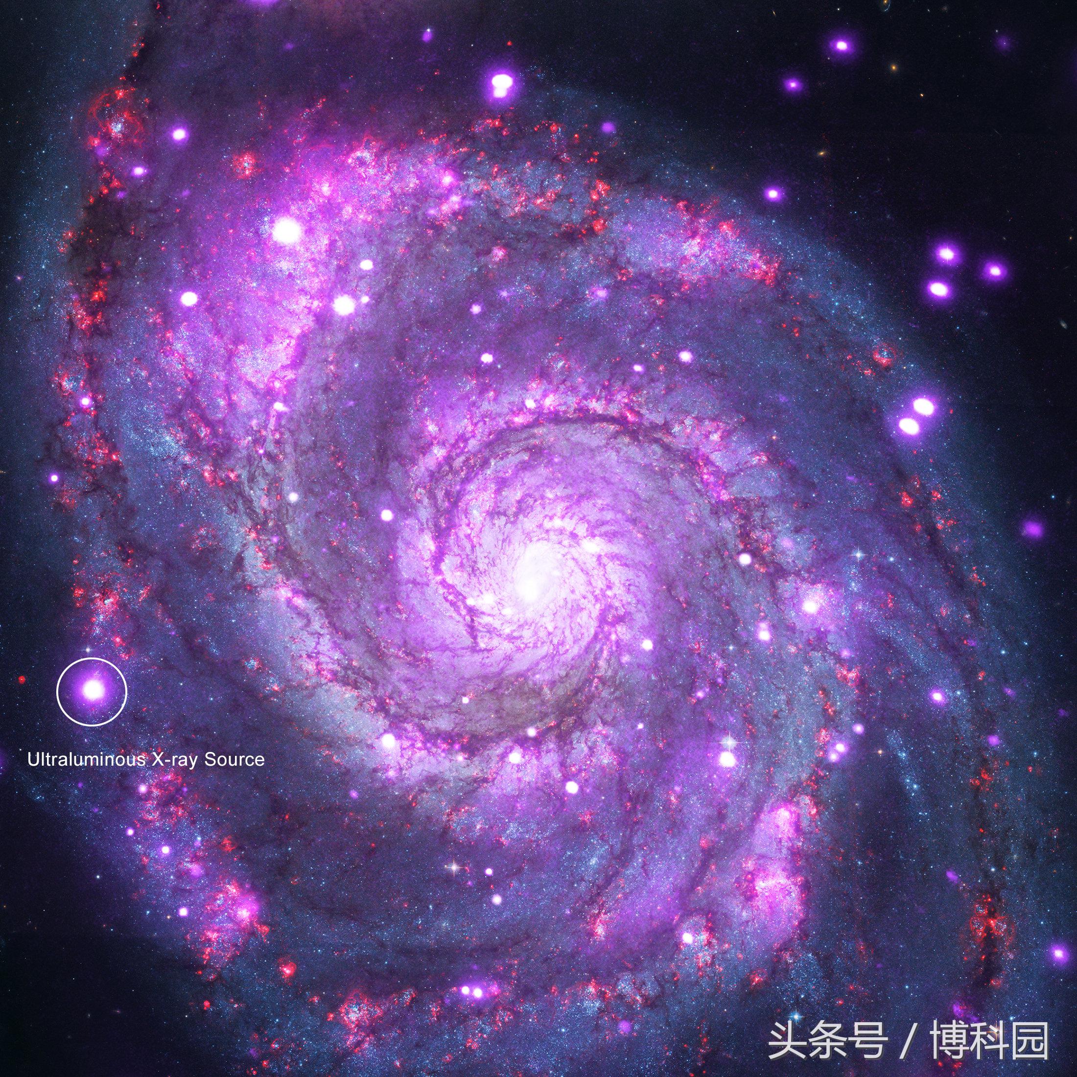 漩涡星系(M51)美国宇航局钱德拉x射线天文台所看到的x射线照片是紫色的,美国宇航局的哈勃太空望远镜的可见光是红色、绿色和蓝色的。在新的加州理工学院领导的研究中指出了超铝x射线源,即ULX。图片版权:NASA/CXC/Caltech/M.Brightman et al.; Optical: NASA/STScI
