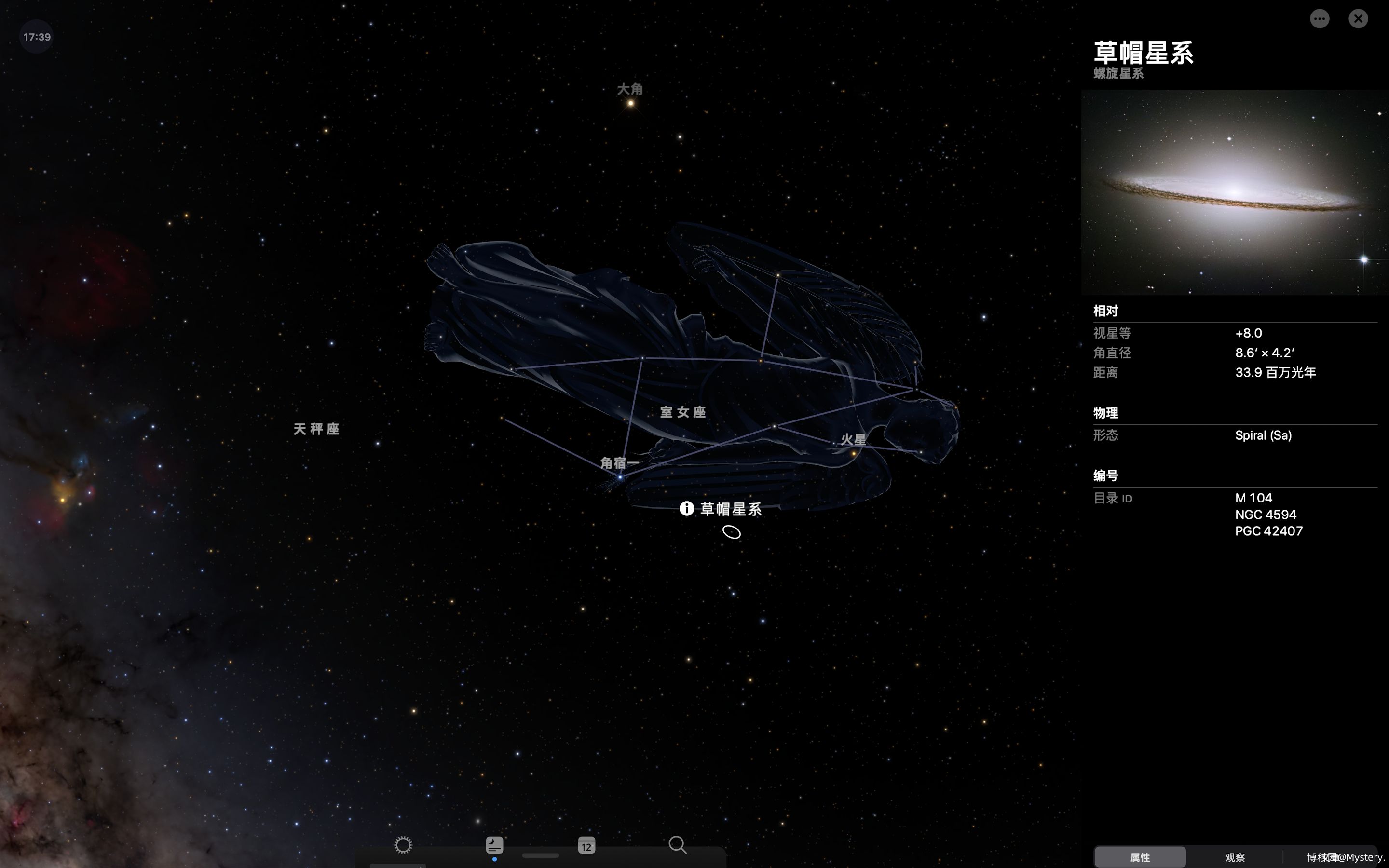 阔边帽星系(梅西耶编号:M104,NGC 4594,又称草帽星系、墨西哥帽星系)位于室女座,为一个Sa-Sb型之旋涡星系,光度 8.7等,距离地球2,800万光年。 它具有明亮且巨大的星系核,尤其在赤道方向有一条由星际尘埃所形成的暗带。由于它形态美丽,也是不少天文台,甚至是拥有专业天文摄影设备的天文爱好者必定拍摄的对象之一。