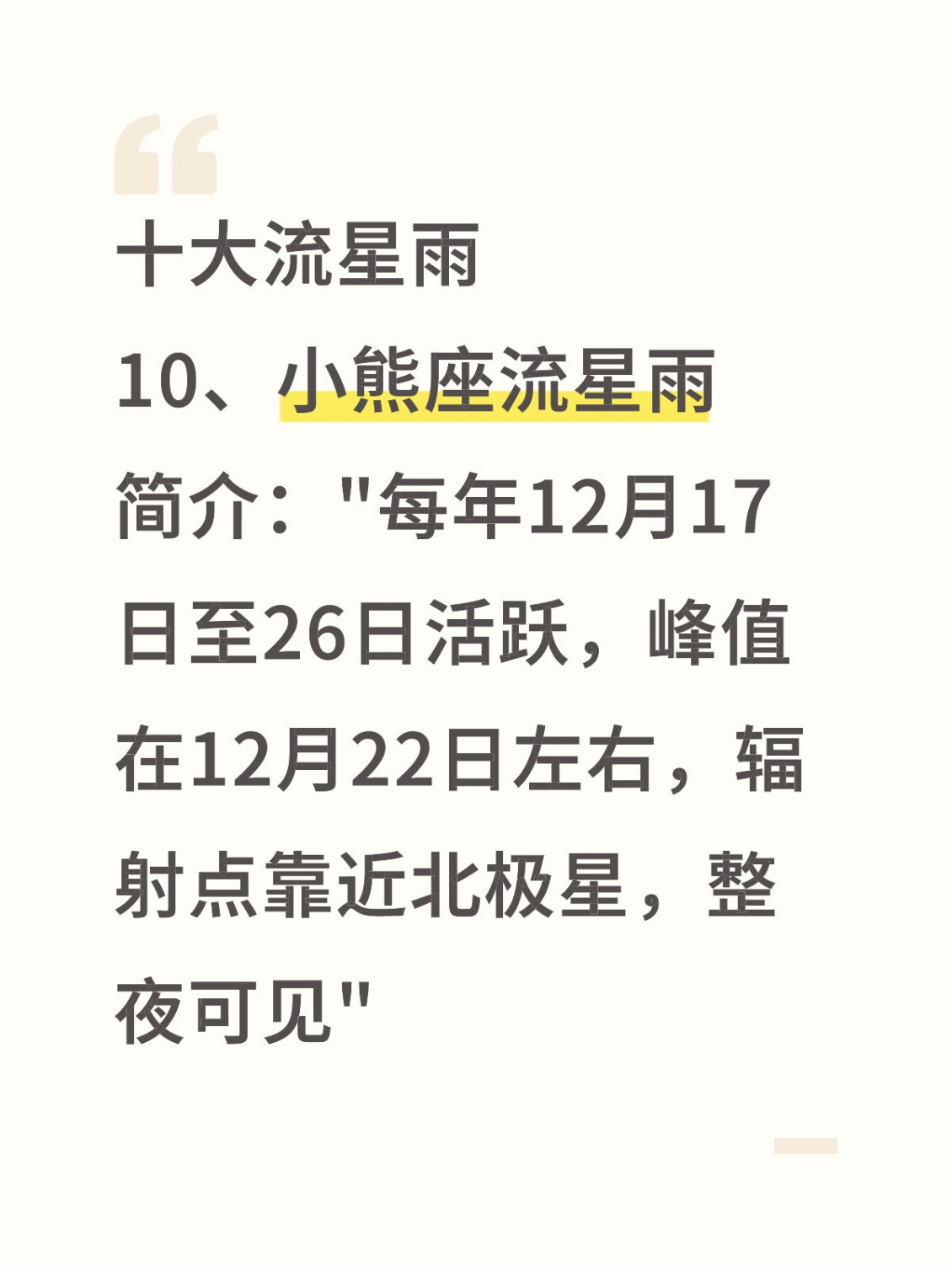 盘点夜空中最壮观的十大流星雨: 1、英仙座流星雨 2、双子座流星雨 3、象限仪座流星雨 4、狮子座流星雨 5、天琴座流星雨 6、猎户座流星雨 7、宝瓶座η流星雨 8、天龙座流星雨 9、金牛座流星雨 10、小熊座流星雨