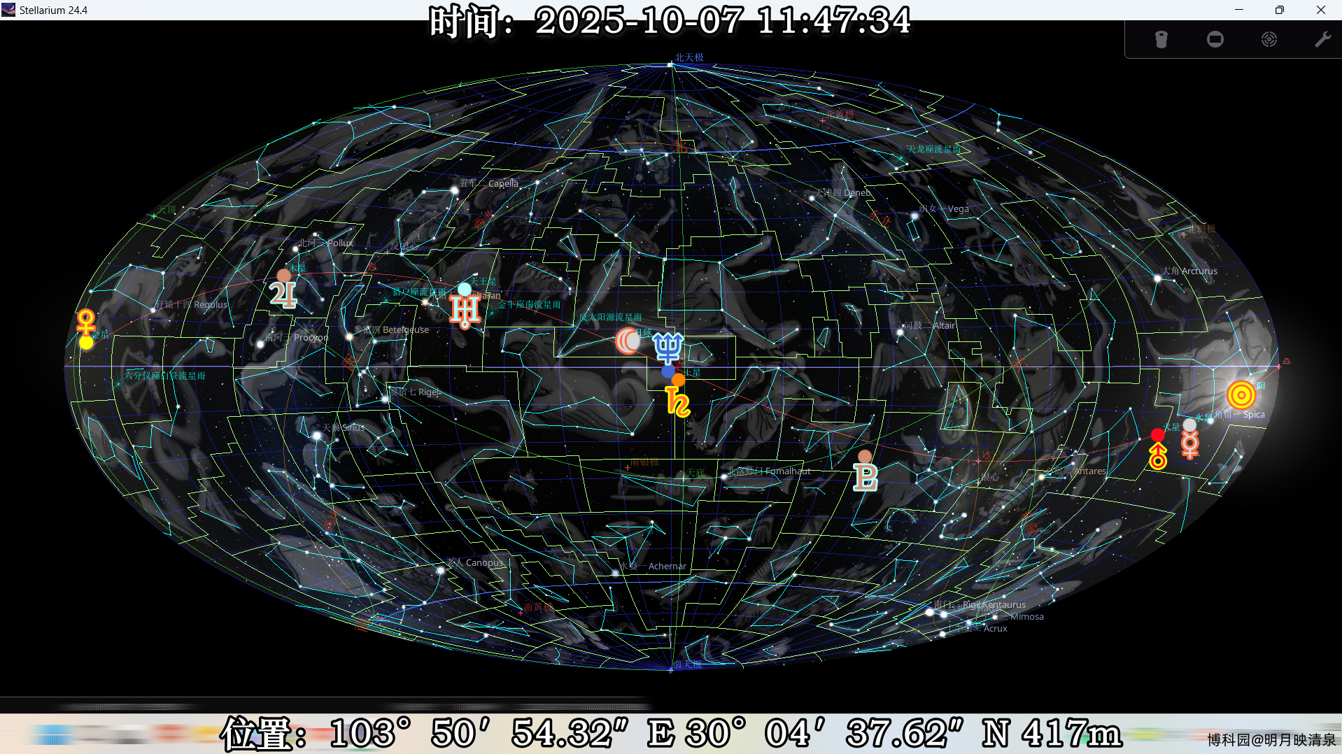 2025 年农历八月望月时刻点*( 10 月 7 日 11 : 47 : 34 )的实时星图