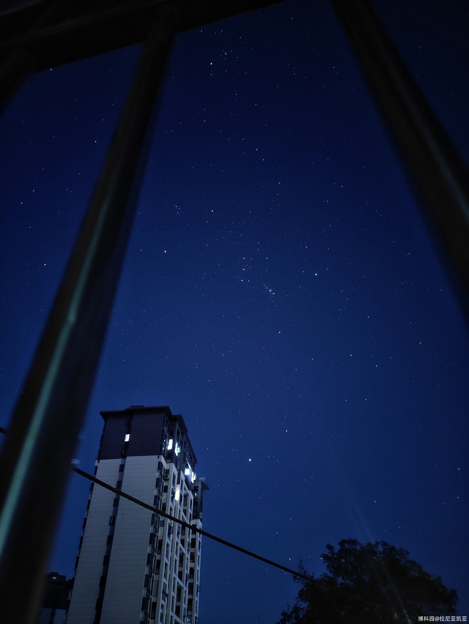 在自家阳台上拍的,时间是接近10月5日凌晨3点的时候,使用了手机相机的专业模式,调整了部分参数,算是人生中的第1张亲手拍摄的星空照😁(由于是深夜凌晨,光污染大约由5级降到了3级)