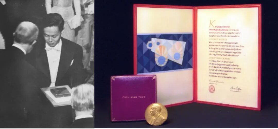 △左:1957年杨振宁自瑞典国王手中接受诺贝尔奖章;右:诺贝尔奖章与奖状