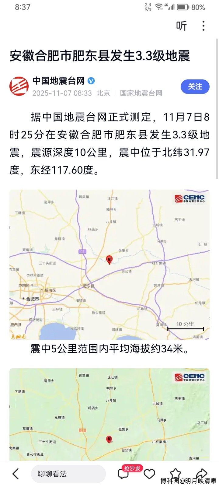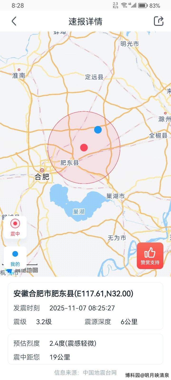 今天早晨起来,我刚刚吃过早饭,正在饭桌边刷手机,突然发觉到地上一阵摇晃。中国地震台网后正式测定,2025年11月17日08时25分,在肥东县发生里氏3.3级地震,震中位于31.97°N,117.60°E,震源深度10km。地震发生时,我所在位置正在下雨。 按照我的惯例,突发事件以动态的形式告知平台。由于近期我的账号不是特别活跃,所以希望本动态尽快过审,以告知大家。