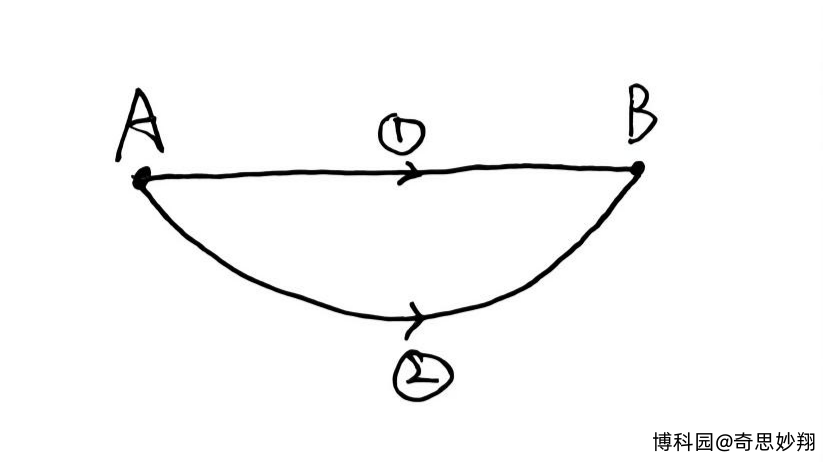 如图所示,现取其两条光路,分别为光路①和光路②。现在我们令1号观测者观测光从点A到点B的运动轨迹,发现光走是光路①;我们再令2号观测者观测光从点A到点B的运动轨迹,发现光走是光路②。其中1号观测者是静止不动的,2号观测者以速度v向正右方做匀速直线运动。