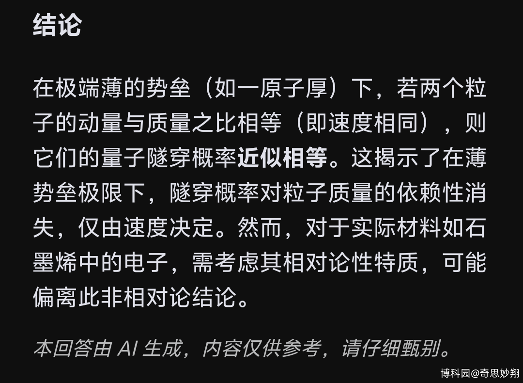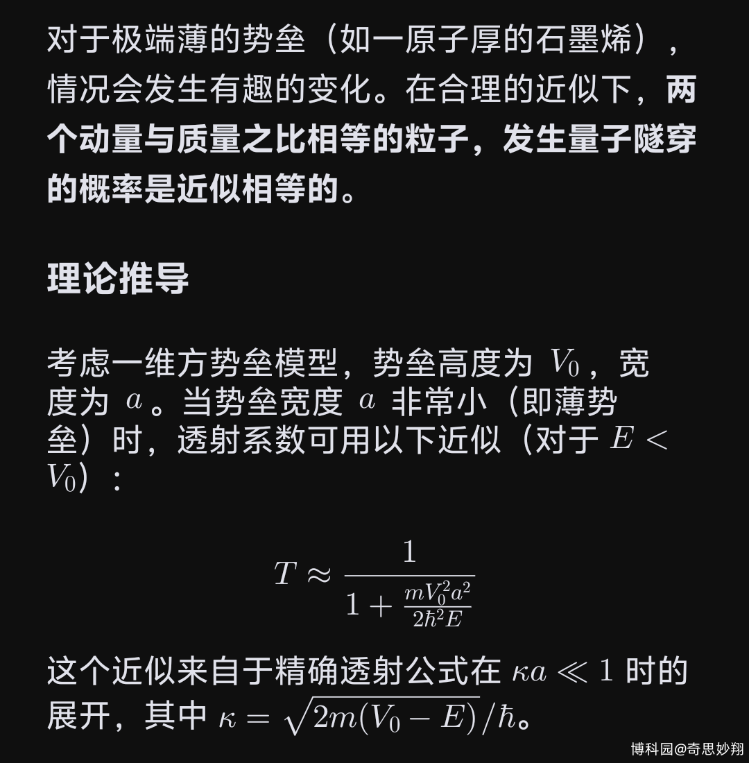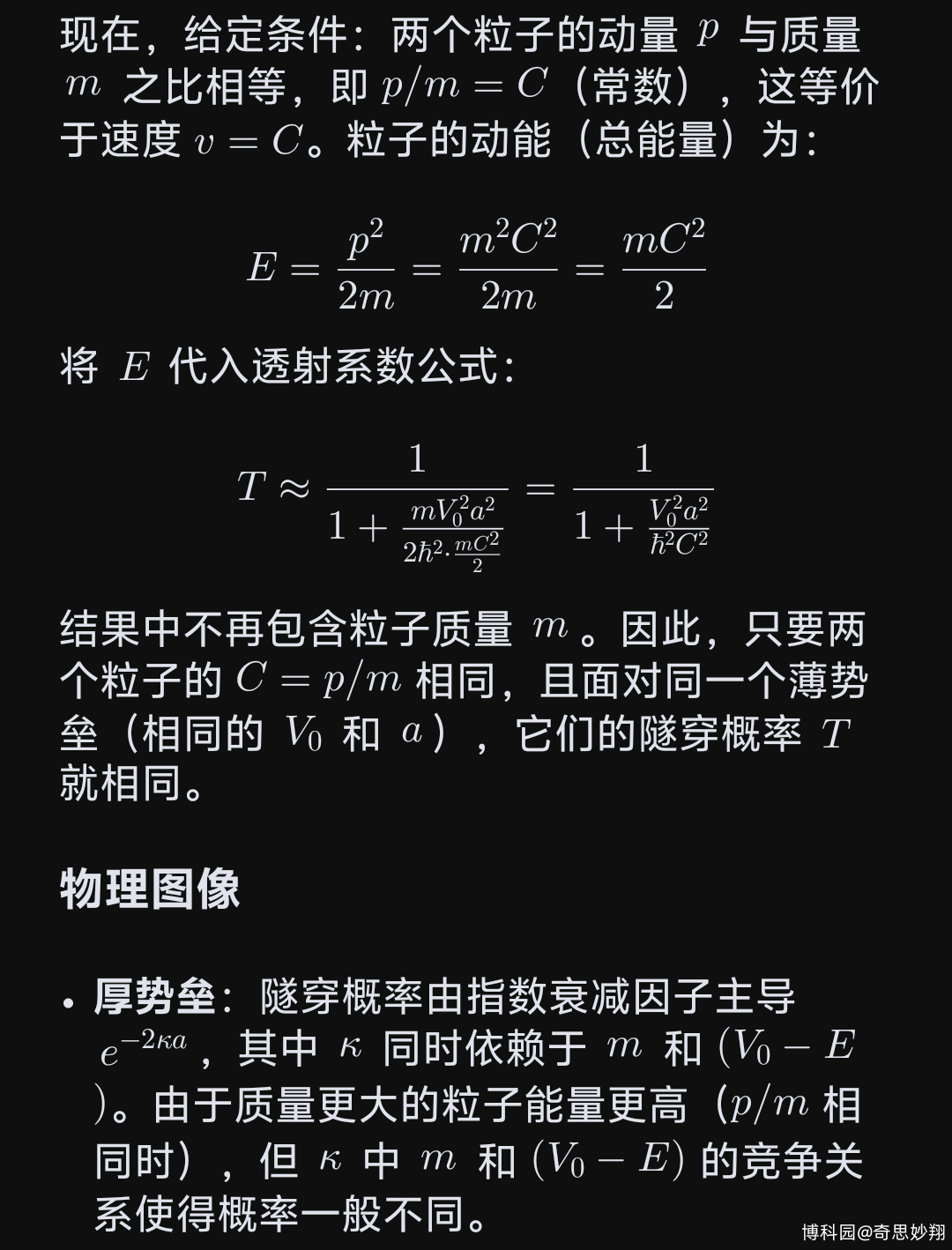 因为动量p=mv,所以这是我的问题:若有这样的两个粒子,它们的动量与其质量之比相等,现在需要让它们穿过一堵非常薄的墙(比如只有一个原子厚的石墨烯),那么它们发生量子隧穿的概率相等吗?