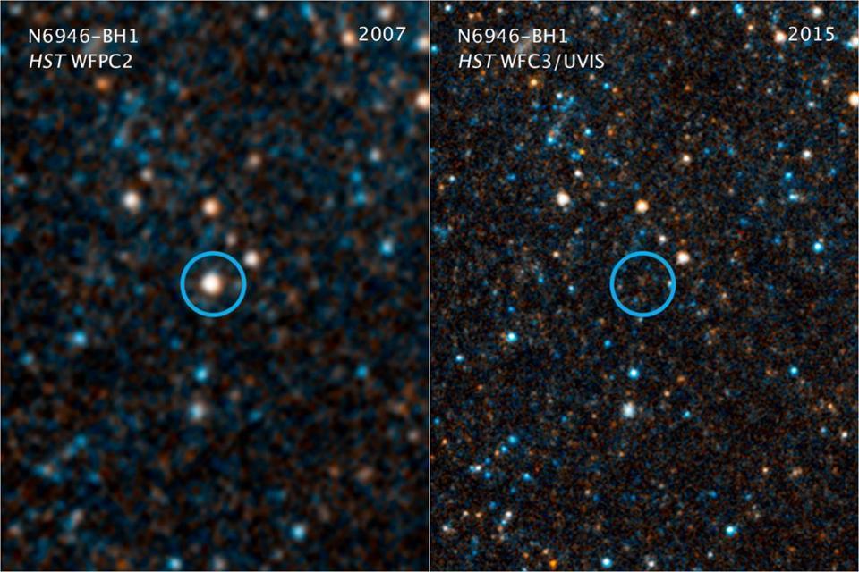 来自哈勃望远镜的可见光/近红外照片显示了一颗大质量的恒星,大约是太阳质量的25倍,它已经不存在了,超新星或其他不能够解释。直接坍塌是唯一合理的候选解释。图片版权:NASA/ESA/C. Kochanek (OSU)