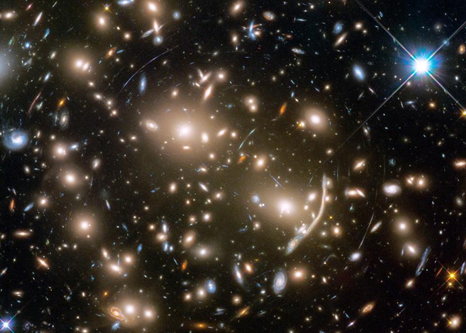 2、当一个星团背景中有明亮的大质量星系时,由于广义的相对论效应(称为引力透镜),它们的光将会被拉伸,放大和扭曲。
