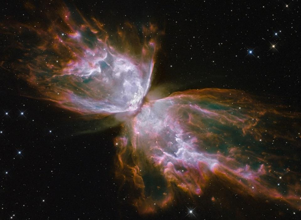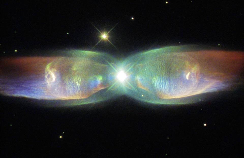 18、这个行星状星云被称为“蝴蝶星云”,但实际上它是炽热电离的发光气体在垂死的恒星的垂死挣扎中被吹走,并被这颗垂死的恒星留下的热的白矮星所照亮。