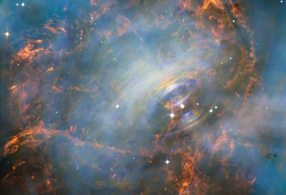 16、这张蟹形星云核心的图像是一颗年轻的大质量恒星,最近在一次壮观的超新星爆炸中死亡,呈现出这些特征的波纹,这是由于一个脉冲,快速旋转的中子星(脉冲星)。