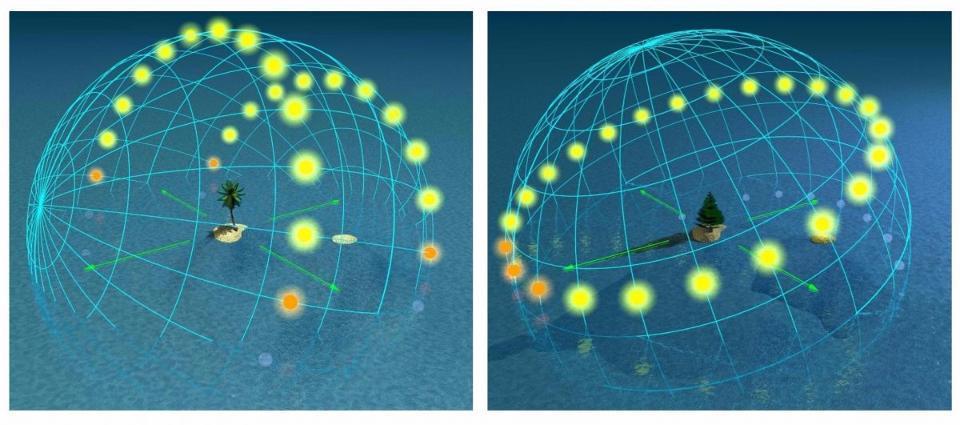 赤道附近,在纬度20度(左)与远离赤道70度纬度(右)处,太阳在天空中的明显的路径在赤道上是非常不同的。图片版权:Wikimedia Commons user Tauʻolunga