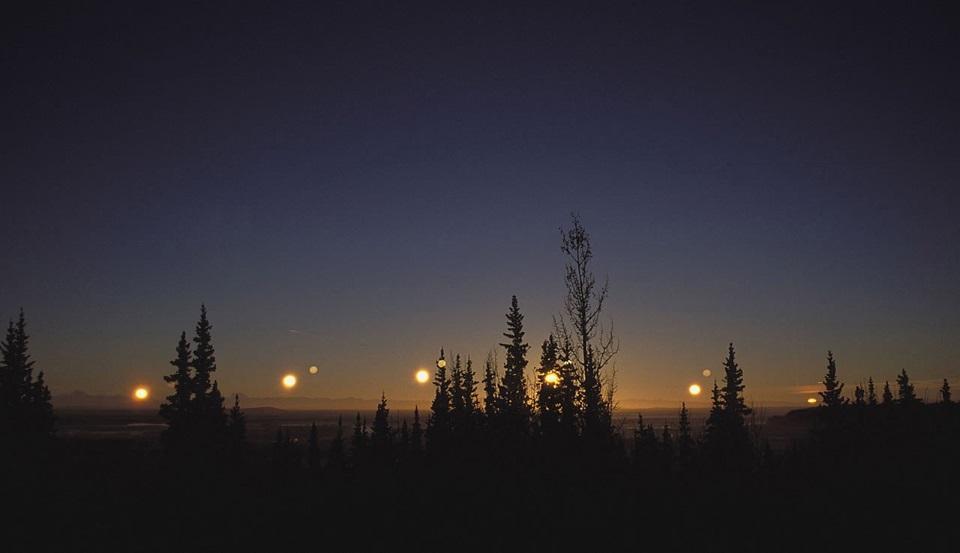 在冬至时,越往北,太阳出现的时间越低,包括地平线以上的最高点。从费尔班克斯,阿拉斯加,如图所示永远不会超过地平线以上几度。图片版权:Ken Tape