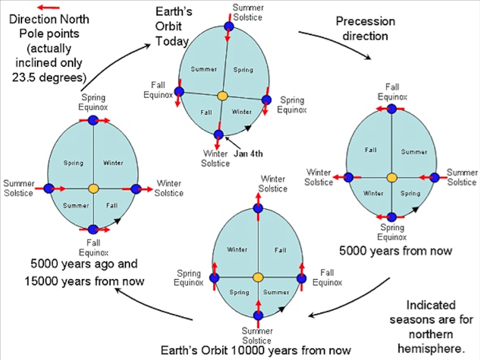 这两种年份的测量数据略有不同,大约有26000年;再加上地球轨道相对于恒星的更小的内部岁差(主要是由于其他行星),我们得到的是冬至周期每21000年通过一个完整的轨道。冬至正好与近日点重合,而近日点则在短短几周后就出现了——就在800年前,而且已经逐渐远离它;在大约1万年的时间里它将与远日点重合,或者是离太阳最远的点!在过去的星期四的冬至是你一生中所经历过的最接近太阳的冬至。