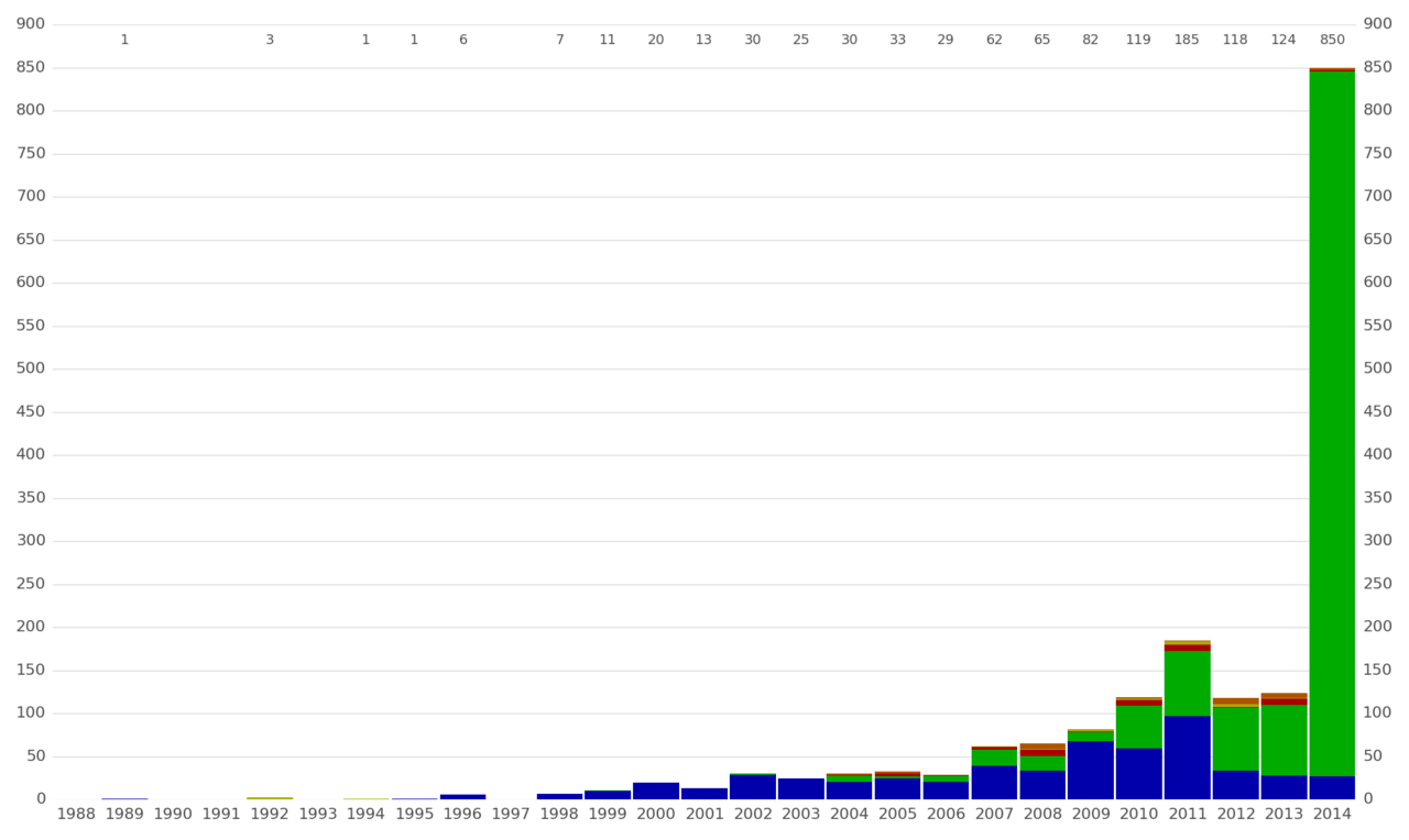 从2014年9月开始,每年的太阳系外行星发现数量,颜色表示探测方法-径向速度(蓝色),传输(绿色),定时(黄色),直接成像(红色),微透镜(橙色)。图片:Public domain
