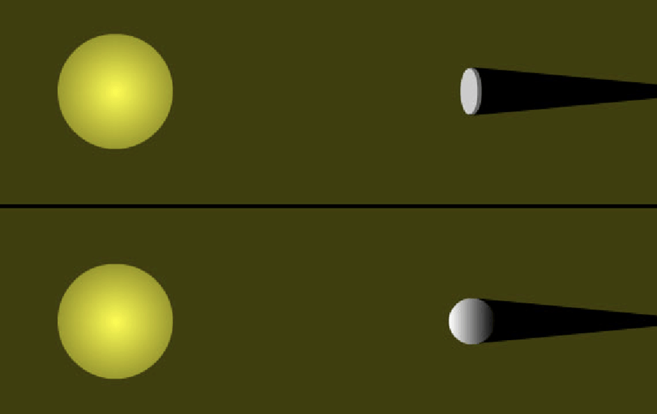 地球可以在月球上投下一个圆形阴影:作为一个球形物体(底部)或圆盘状物体(顶部)。但要注意的是,如果它是一个圆盘,那么这个圆盘必须是面朝上的,否则地球的影子不会出现圆形。图片版权:Windows to the Universe Original (Randy Russell)