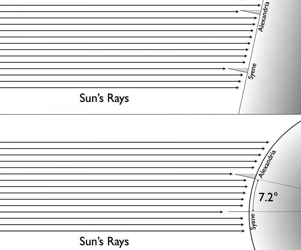 如果地球是完全平坦的,那么无论你在哪里,太阳光线都会在地球(顶部)的任何地方,在正午的时候投射出相同的阴影。但如果地球表面是弯曲的(底部),不同位置的阴影将在同一天投射出不同的阴影,这取决于太阳光线击中目标的角度。如果我们走得更远,一个平坦的地球就会有相同的角度,因此都是同一个季节,无处不在。