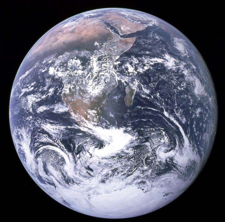 2001 – 2002年由美国国家航空航天局(NASA)的中分辨率成像光谱仪(MODIS)数据建造的蓝色地球复合图像。尽管这些证据很容易观测,但它们并没有直接从空间观看地球的视角。图片版权:NASA