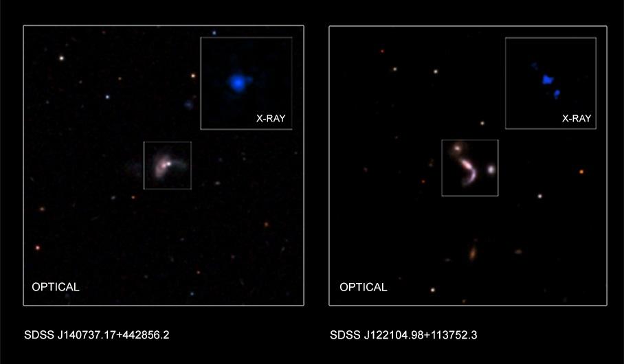 光学和x射线数据在两个新黑洞对中的发现。图片版权:NASA/CXC/Univ. of Victoria/S.Ellison et al./George Mason Univ./S.Satyapal et al./SDSS