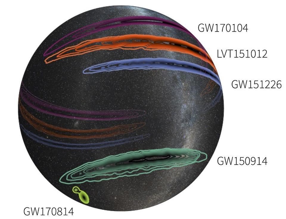 (图注:)在这个银河系的三维投影到一个透明的全球显示三个证实黑洞合并事件的可能位置观察到两个LIGO detectors-GW150914(深绿色)GW151226(蓝色),GW170104(红色),第四个确认检测(GW170814,亮绿色(左下)被处女座和LIGO探测器观测到。同样显示(在橙色)中更低的意义事件LVT151012。图片:LIGO/Virgo/Caltech/MIT/Leo Singer (Milky Way image: Axel Mellinger)