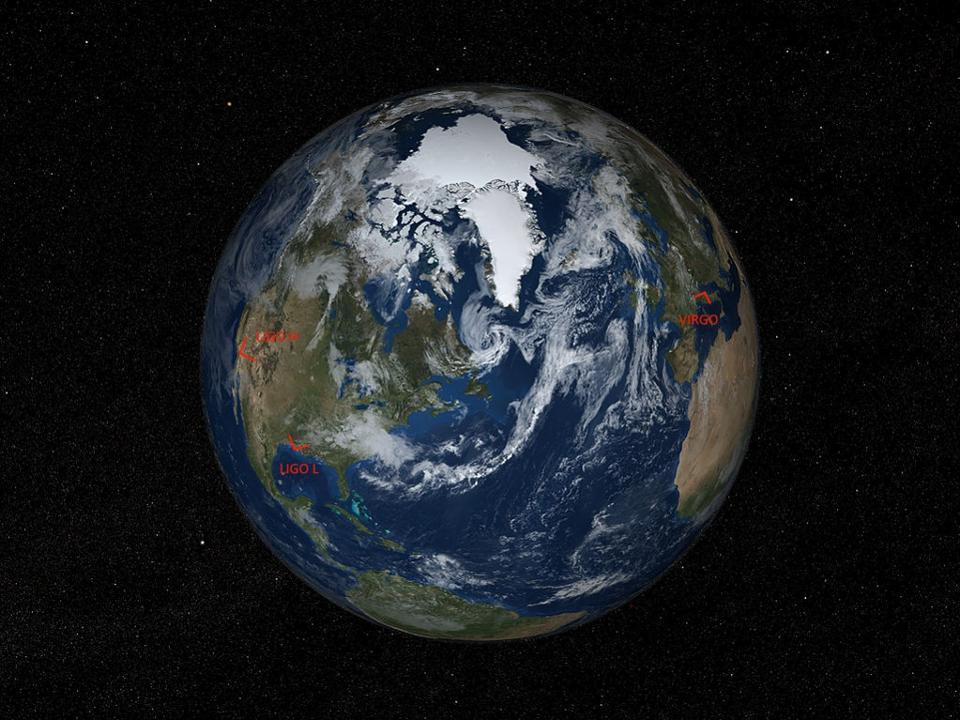 (图注:)今年早些时候意大利的室女探测器加入了两个LIGO探测器已经开始运行了。是3 / 4的LIGO大小,它对引力波并不十分敏感,但随着未来的改良它的灵敏度会提高,就像LIGO探测器一样。但是室处女座与LIGO阵列相比较的一大优点是三重检测能提供确定位置的信息。试想一下一个引力波(如下图所示)穿过地球,但请记住当你想象这个的时候,室女座探测器离孪生LIGO探测器有多远。