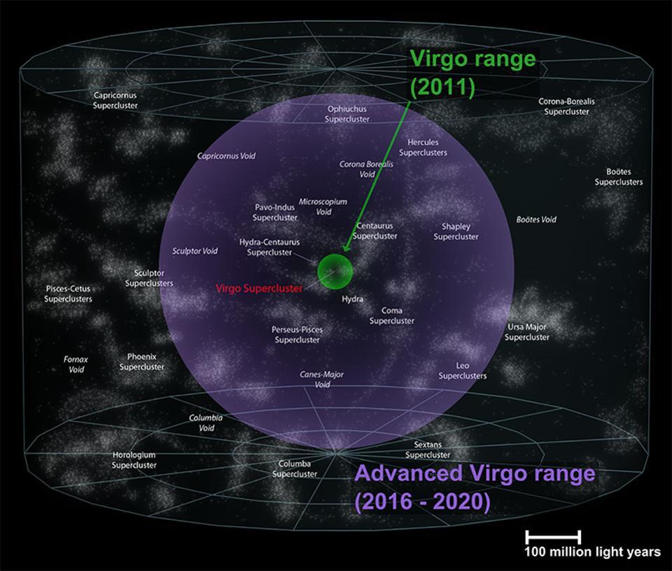 (图注:)最初的室女座(绿色)和高级室女座(紫色)可以接触到的空间体积。当一个波被一个探测器探测到,一个薄的球形外壳告诉你可能的位置,但是有三个独立的球体和方向信息,位置约束是不可思议的。图片:The VIRGO Collaboration