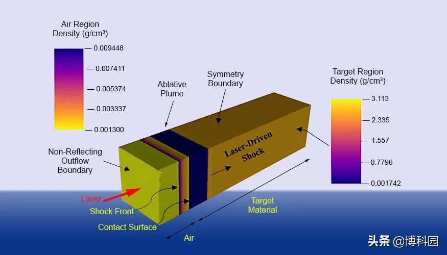 - 在皮秒脉冲激光烧蚀研究中使用的模型说明,该模型是在多物理辐射水动力代码HYDRA中建立的。图中所示为沿激光束中轴方向的一维模型,该模型用于研究材料响应,与三维几何效应无关。图片:Lawrence Livermore National Laboratory