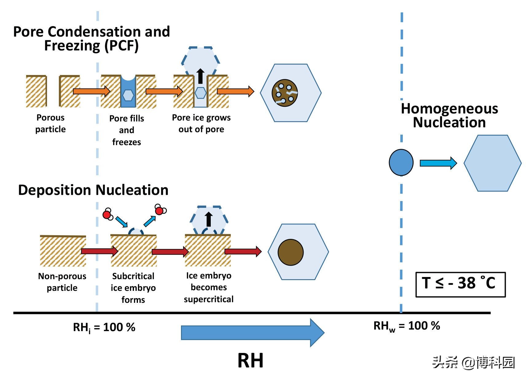 - 图中为孔隙凝结与冻结(左上)、沉积成核(左下)、纯水滴均匀成核(右下)、随后是冰晶生长的路径示意图。垂直虚线表示冰饱和度(左)和水饱和度(右)。图片:PNAS