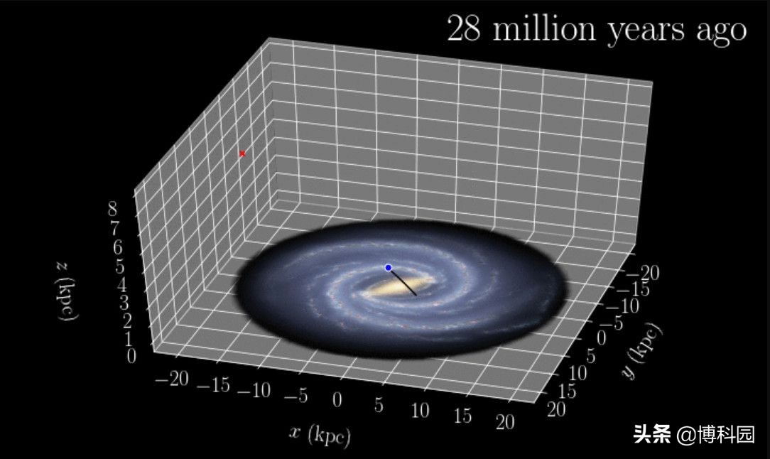 - 利用智利麦哲伦望远镜以及欧洲航天局(ESA)盖亚太空任务的数据,科学家重现了一颗巨大的“超失控恒星”的轨迹。轨迹显示,这颗恒星是从银河系盘中喷射出来,而不是之前认为的银河系中心。图片:Kohei Hattori