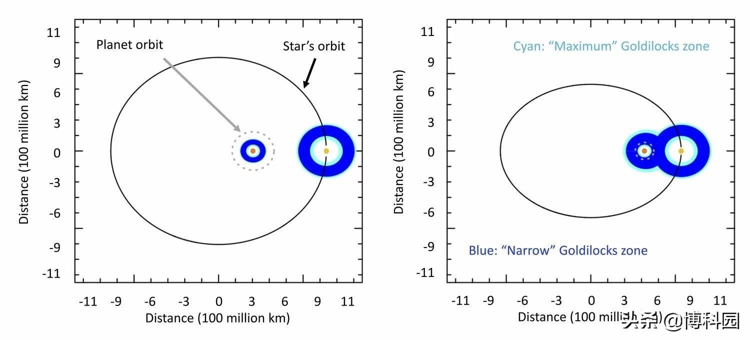 博科园-科学科普:宜居带,有时也被称为“适居带”,因为温度不太热也不太冷,被认为是一个星球上生命发展的必要条件。如果一颗行星位于这个区域之外,那么生命所需的复杂分子的形成就不太可能发生。我们星系中大约三分之一的恒星系统被认为是由两颗或两颗以上的恒星组成,这一比例在恒星年轻时要高得多。如果这些恒星之间的距离相对较远,那么围绕每颗恒星的适居带大小就由每颗恒星发出的辐射决定。如果两颗恒星靠得更近,宜居带大小就会增大,因为每颗恒星都能感受到来自另一颗恒星的额外热量,这就增加了一颗行星位于适宜生命生长地方的可能性。