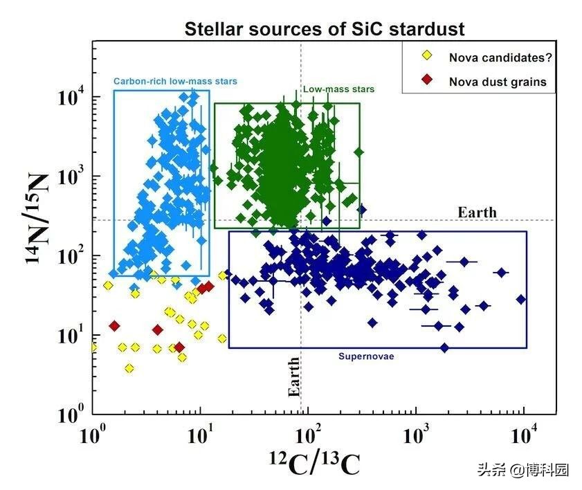 - 绘制星尘颗粒中的碳和氮同位素,根据它们的起源,将它们分成不同的组。新星候选颗粒位于左下方的黄色区域,已证实的新星颗粒位于红色区域,虚线标出了地球平均同位素组成的位置。图片:Bose and Starrfield, ASU