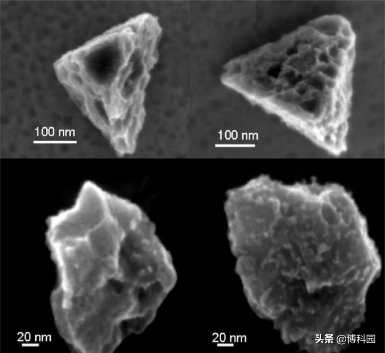 - 碳化硅颗粒是可以从陨石中提取的最耐用颗粒之一,这是四个来自默奇森陨石,人类头发的平均宽度大约是100纳米尺度的1000倍。图片:Amari et al. (1994) Geochimica et Cosmochimica Acta 58, 459-470