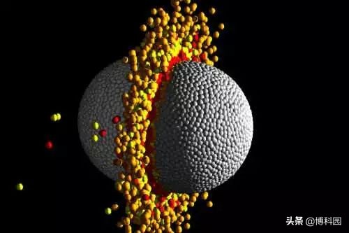 模拟碰撞视频的其中一帧来自于两倍地球质量行星之间高速正面碰撞的流体动力学模拟。材料的温度范围由灰色、橙色、黄色和红色四种颜色表示,其中灰色是最冷的,红色是最热的。这种碰撞会喷射出大量硅酸盐地幔物质,留下一颗高铁含量、高密度的残余行星,类似于开普勒-107c的观测特征。图片:Zoe Leinhardt和Thomas Denman,布里斯托尔大学
